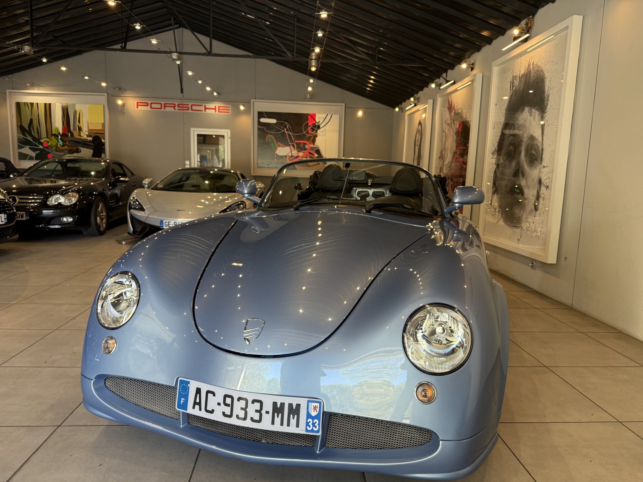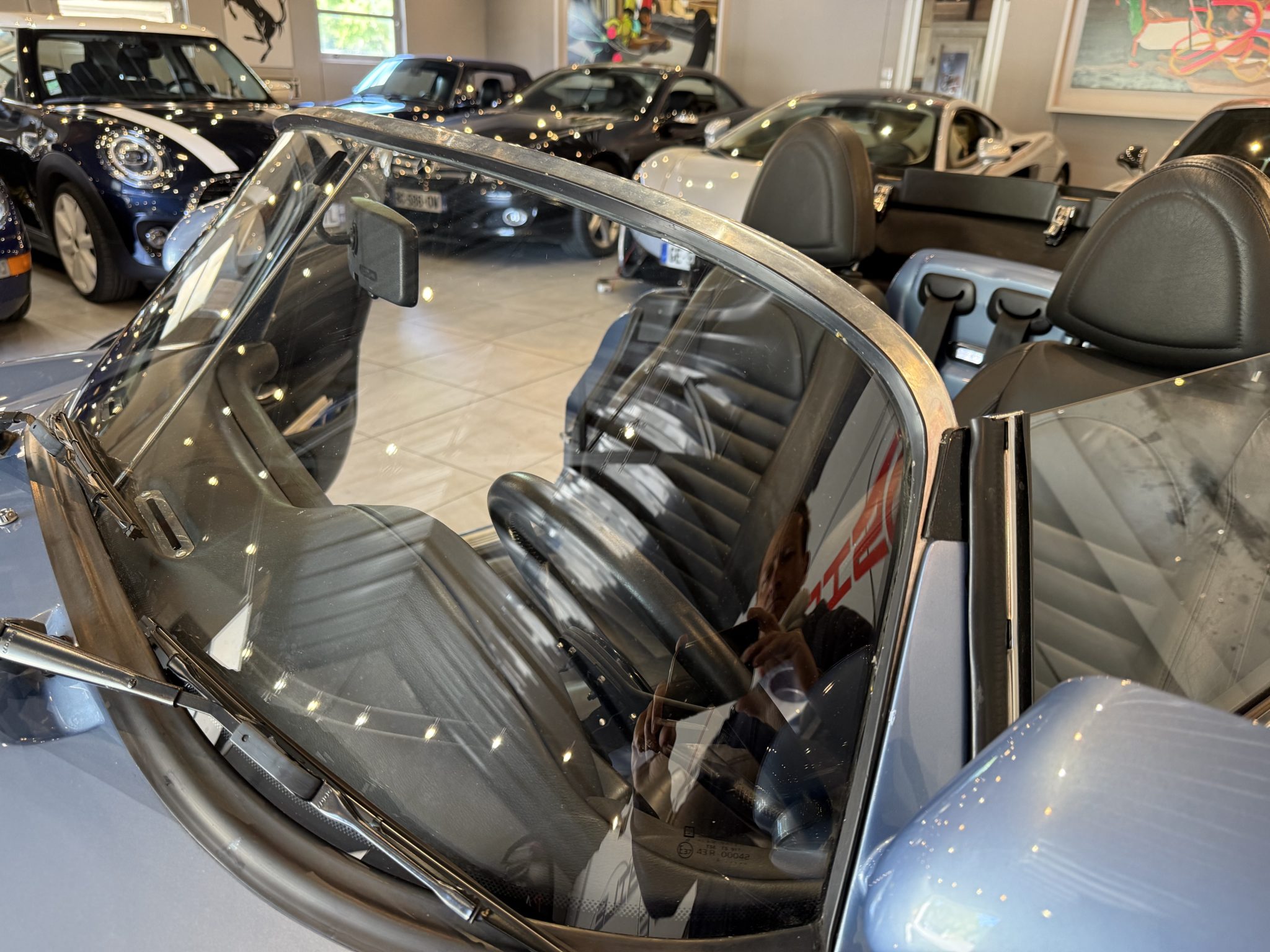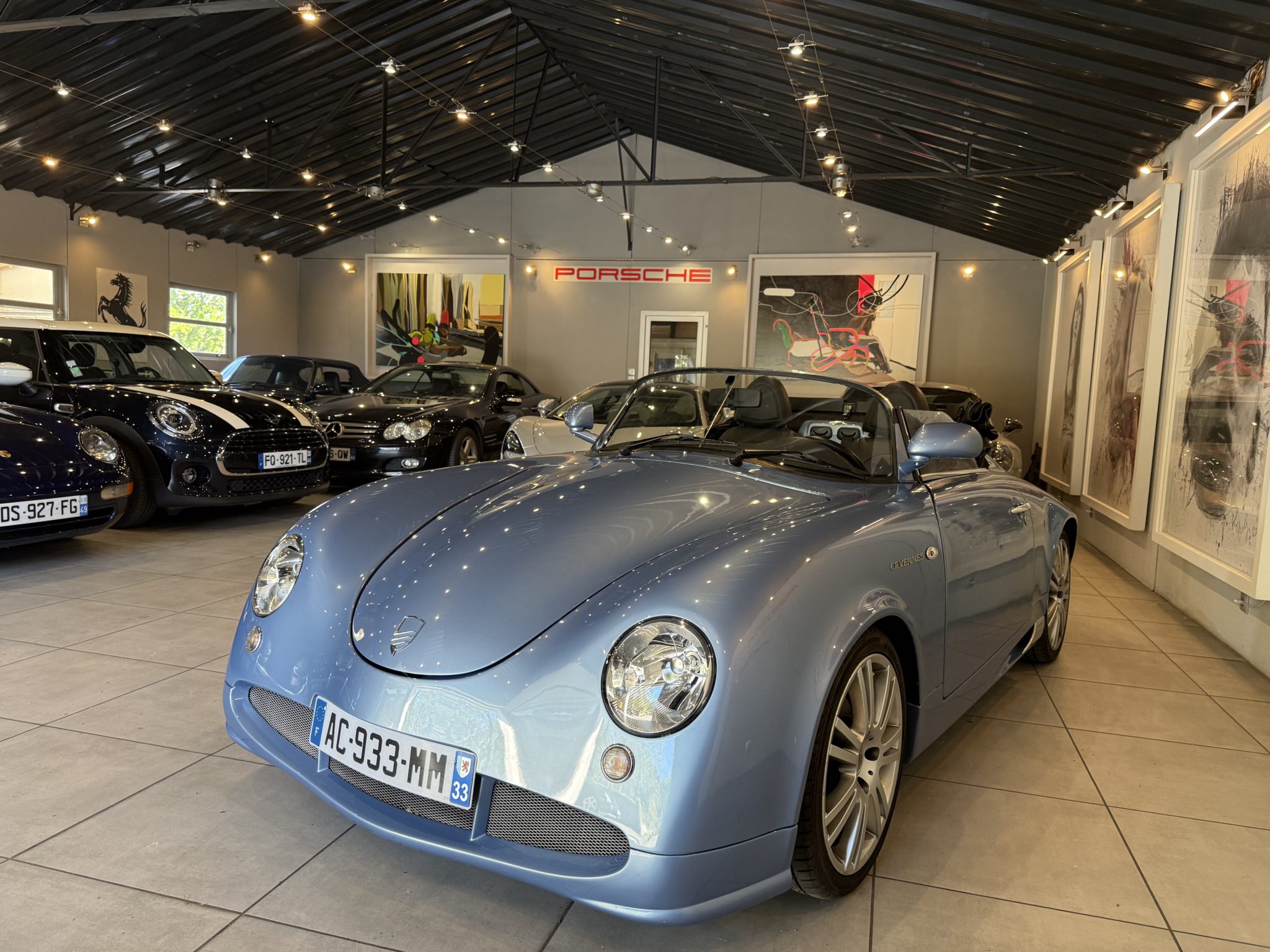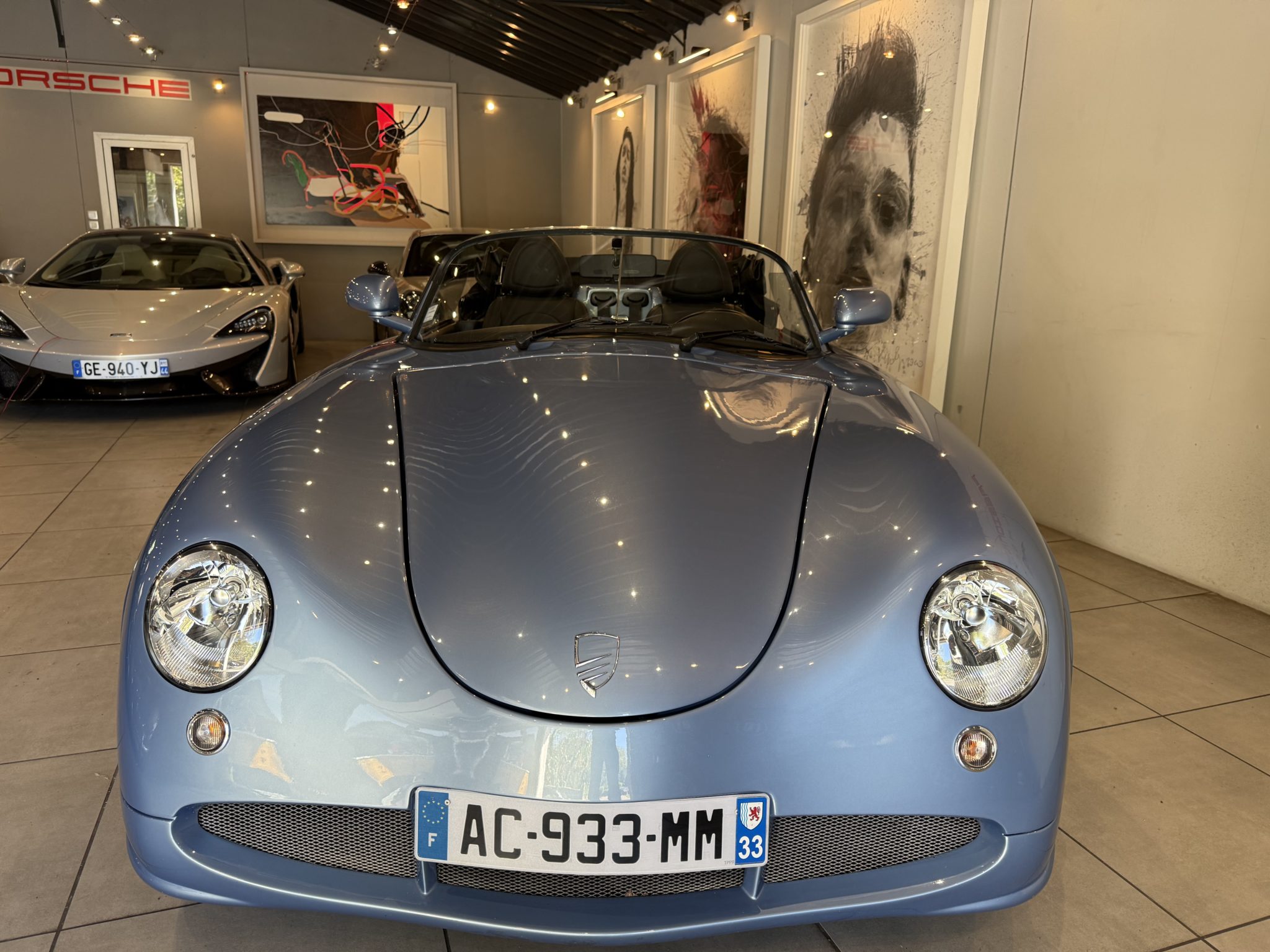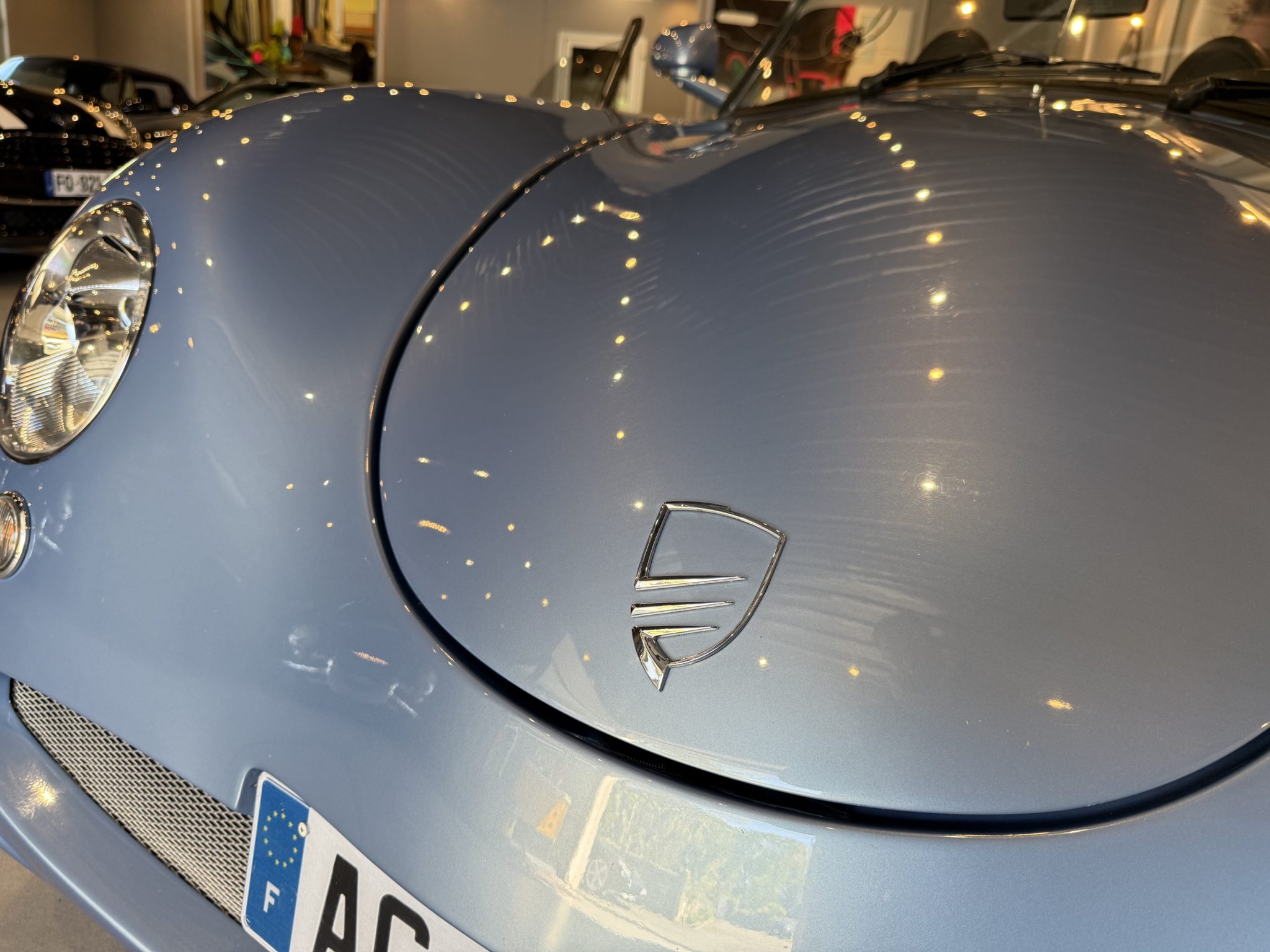Réplique de Porsche 356 par PGO, finition « CEVENNES », bleu dynamique métal, intérieur cuir noir, capote Alpaga, climatisation, couvre tonneau.