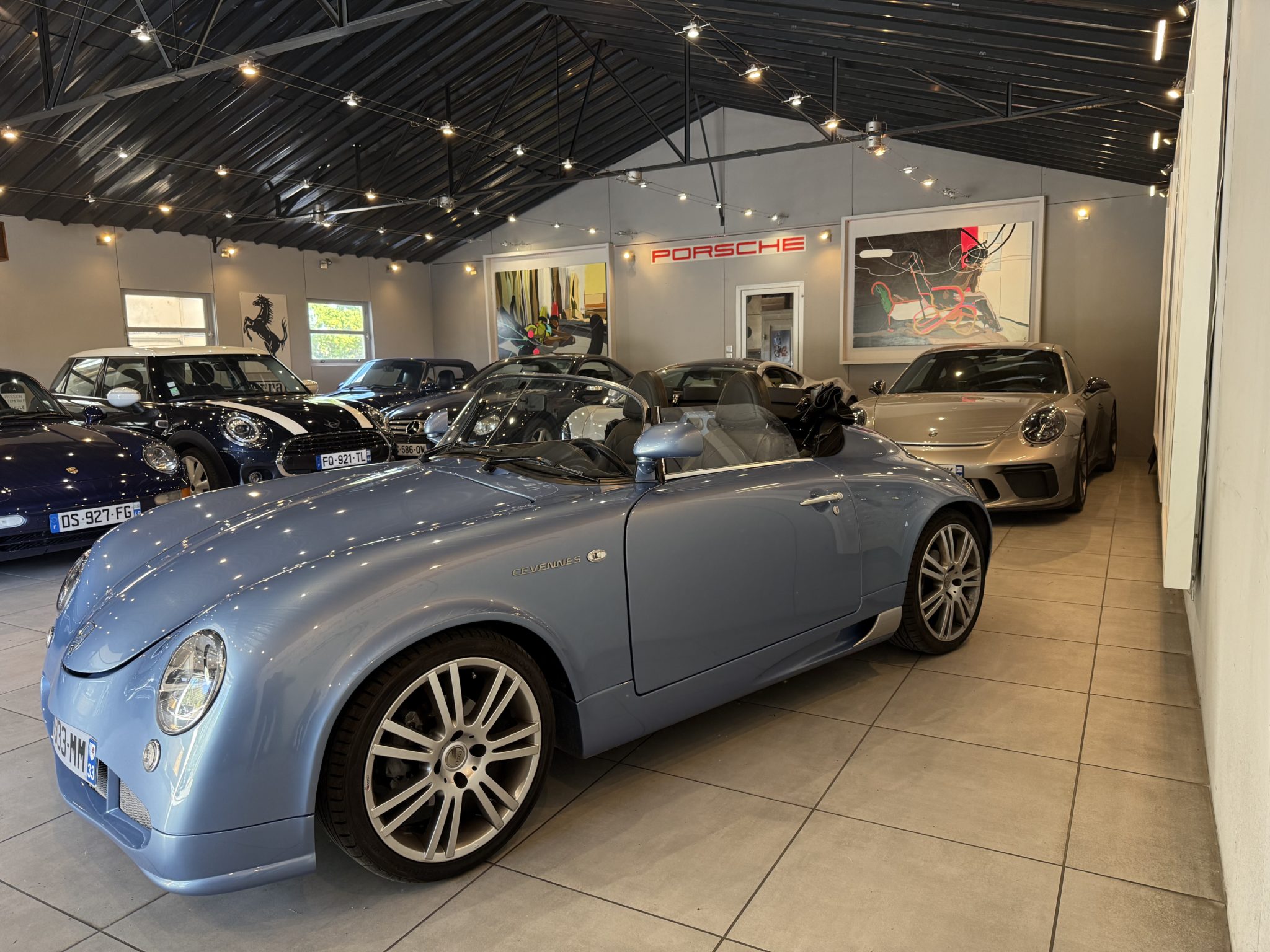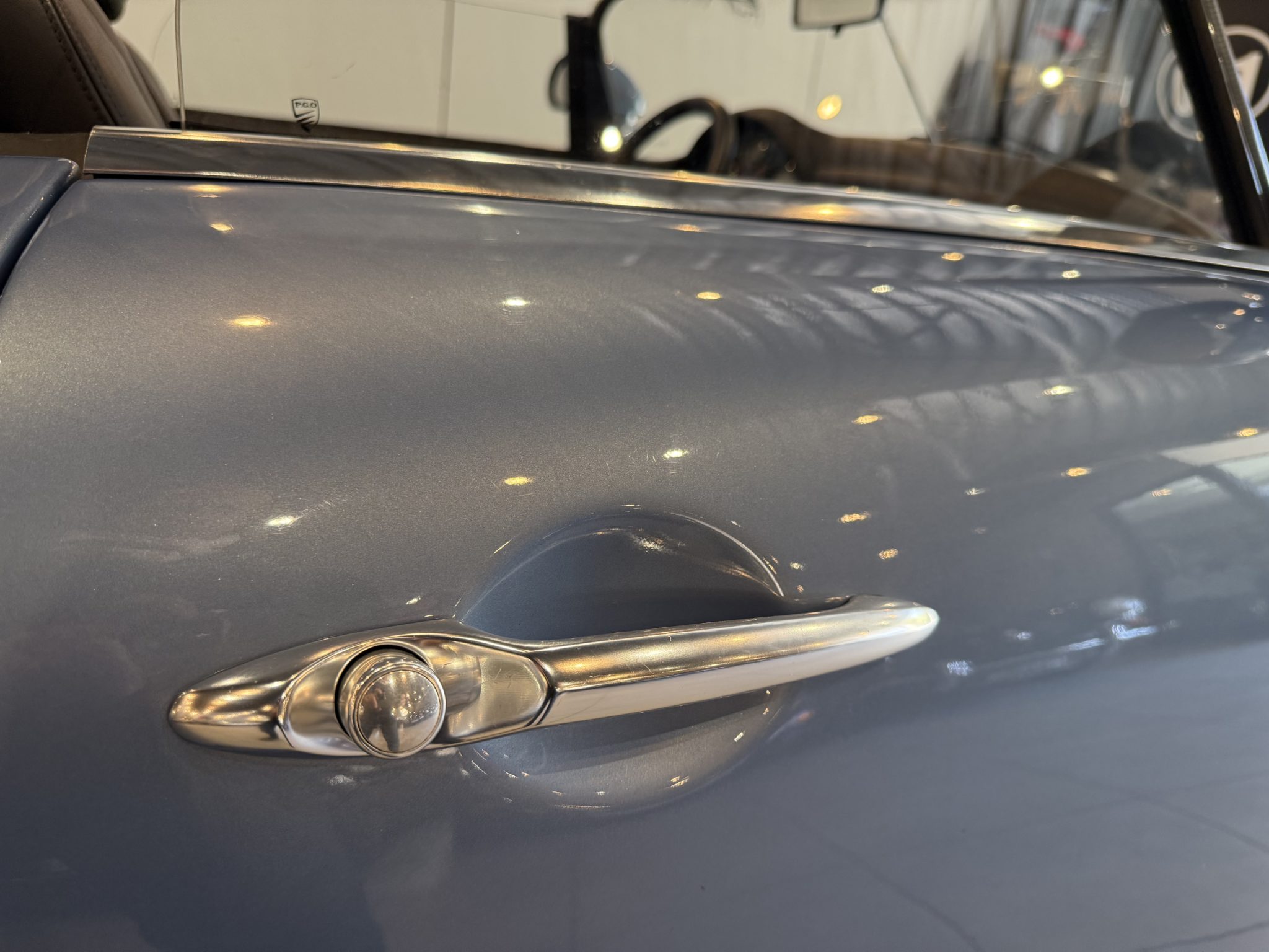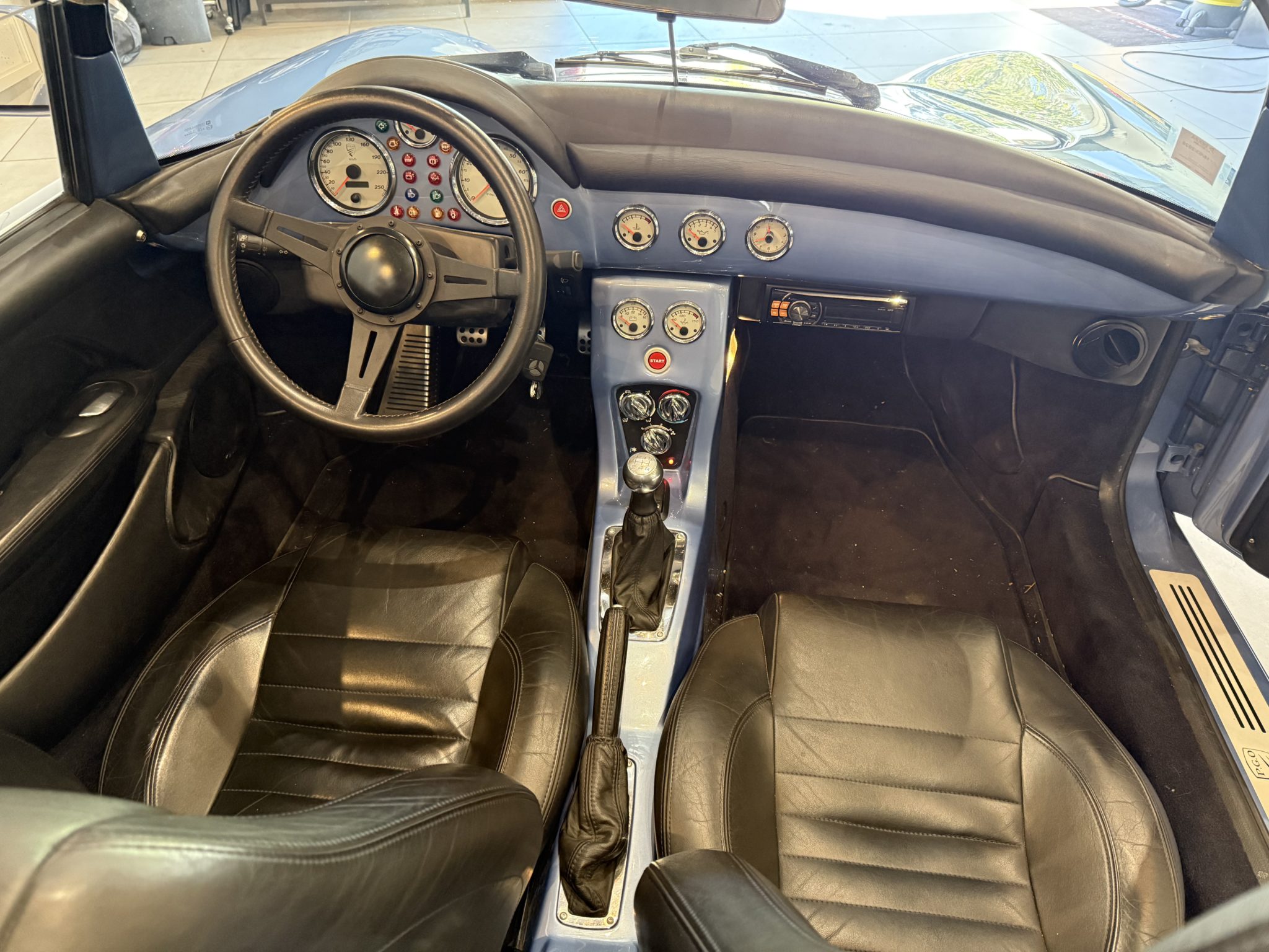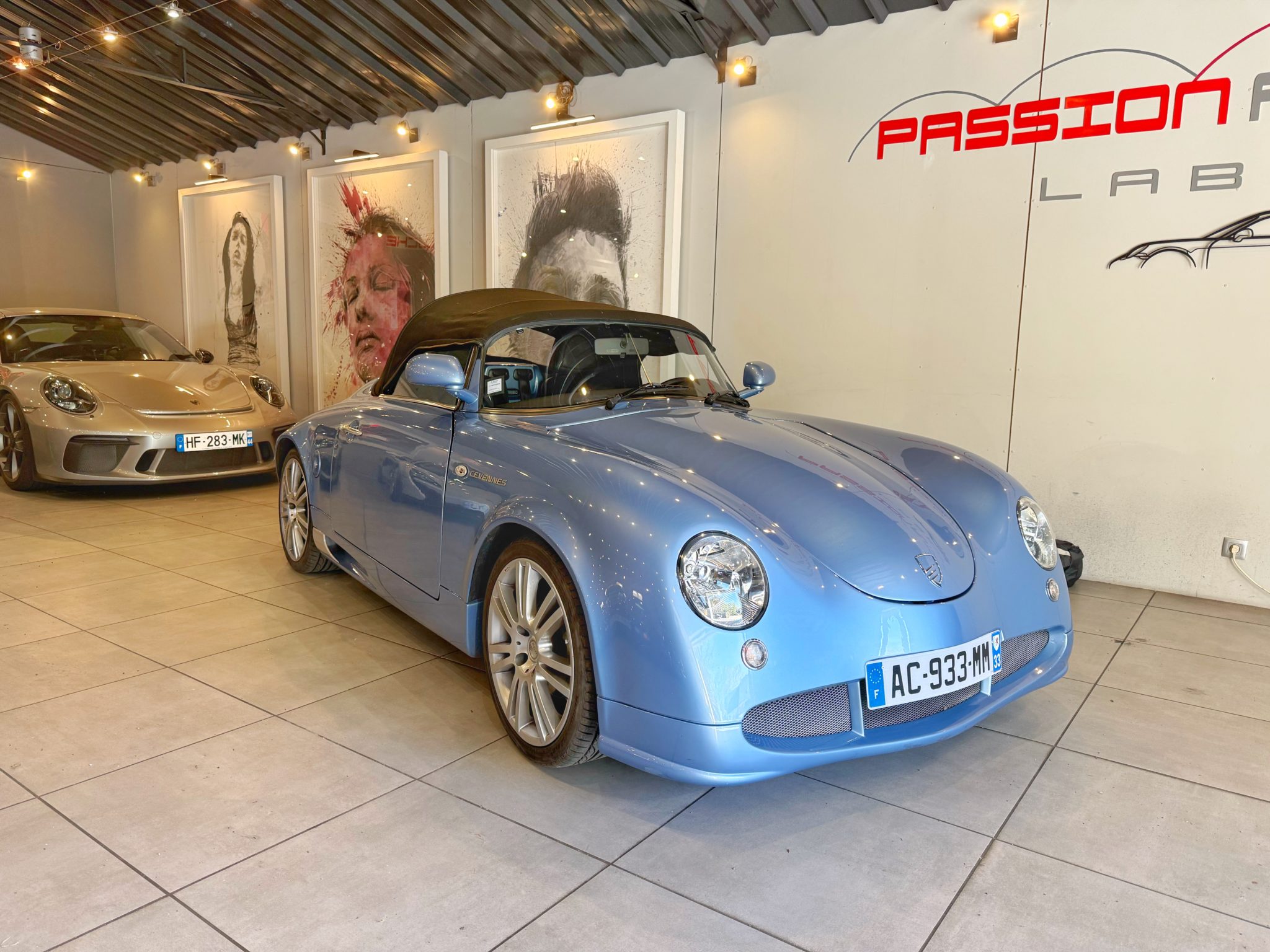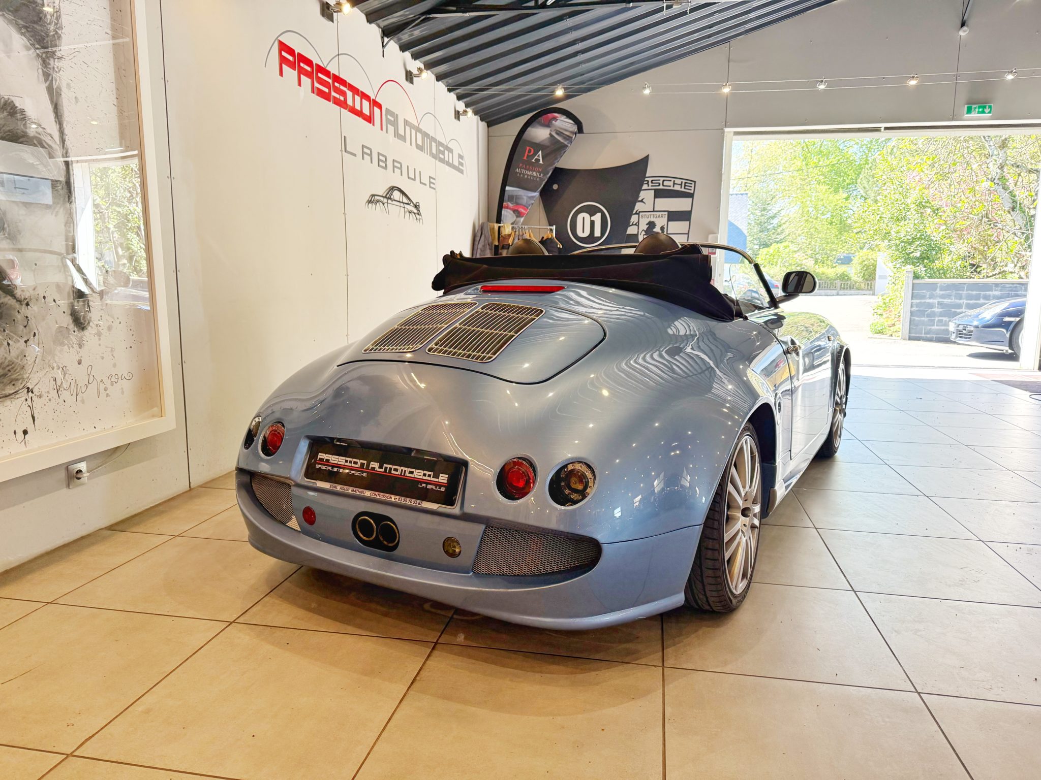 Réplique de Porsche 356 par PGO, finition « CEVENNES », bleu dynamique métal, intérieur cuir noir, capote Alpaga, climatisation, couvre tonneau.
