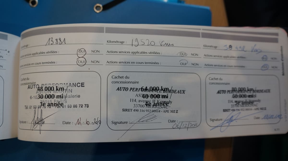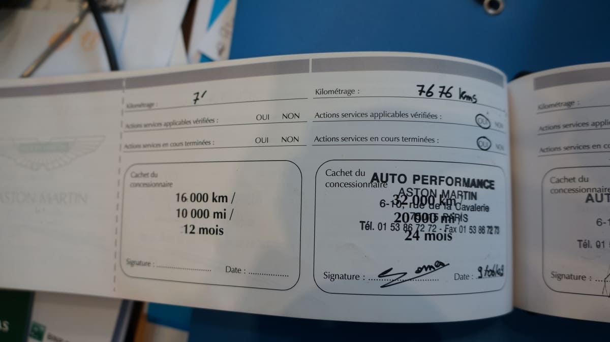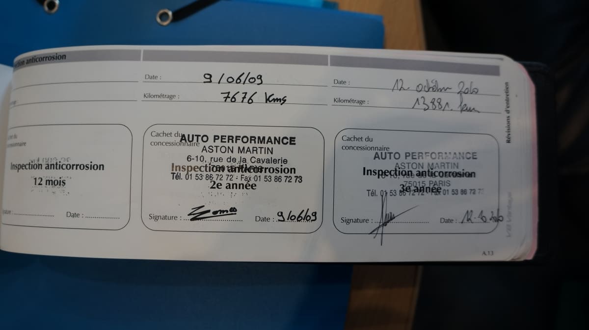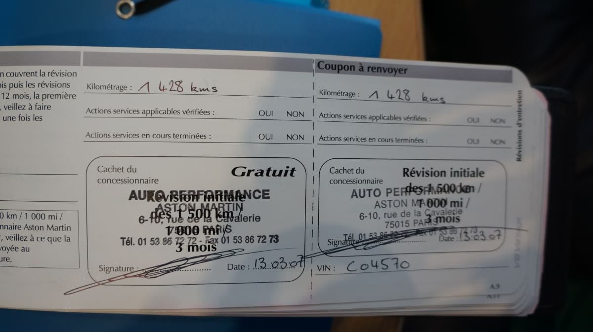 Origine France, entretien 100% Aston Martin Paris, dossier de factures.