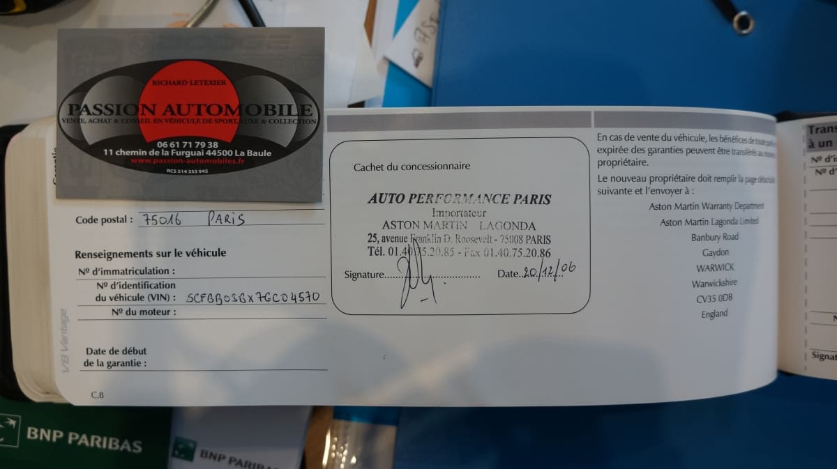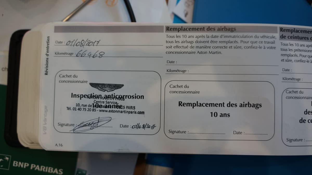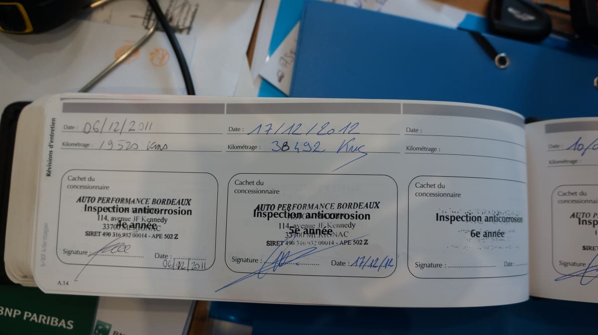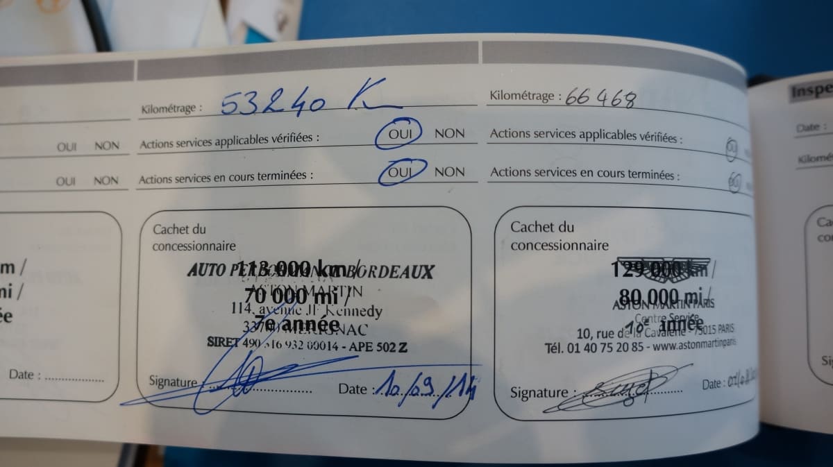 Origine France, entretien 100% Aston Martin Paris, dossier de factures.