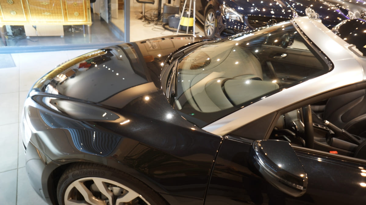 Noir métallisé, intérieur tout cuir noir surpiqures grises.