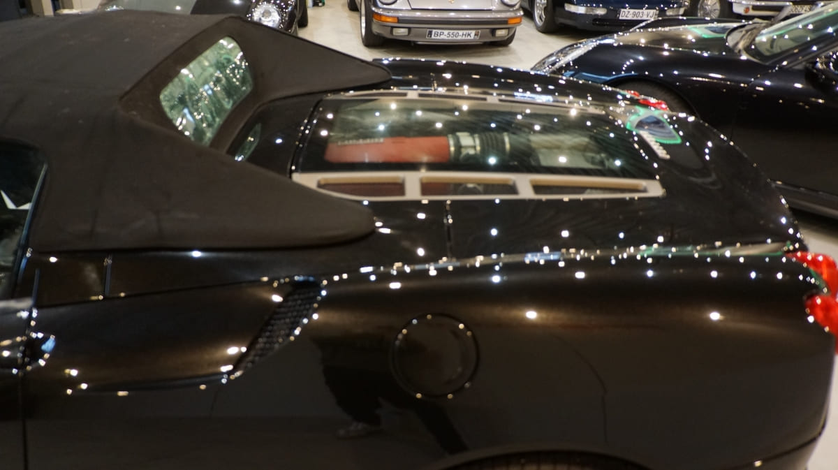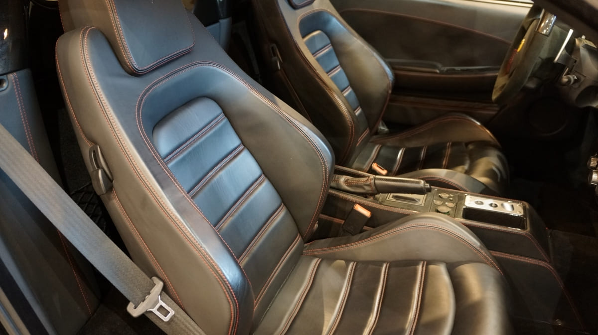 Noir métallisé, cuir noir surpiqure rouge, pack carbone intérieur ( vendu avec le volant origine cuir noir et rouge ). Freins carbone céramique étriers jaune.