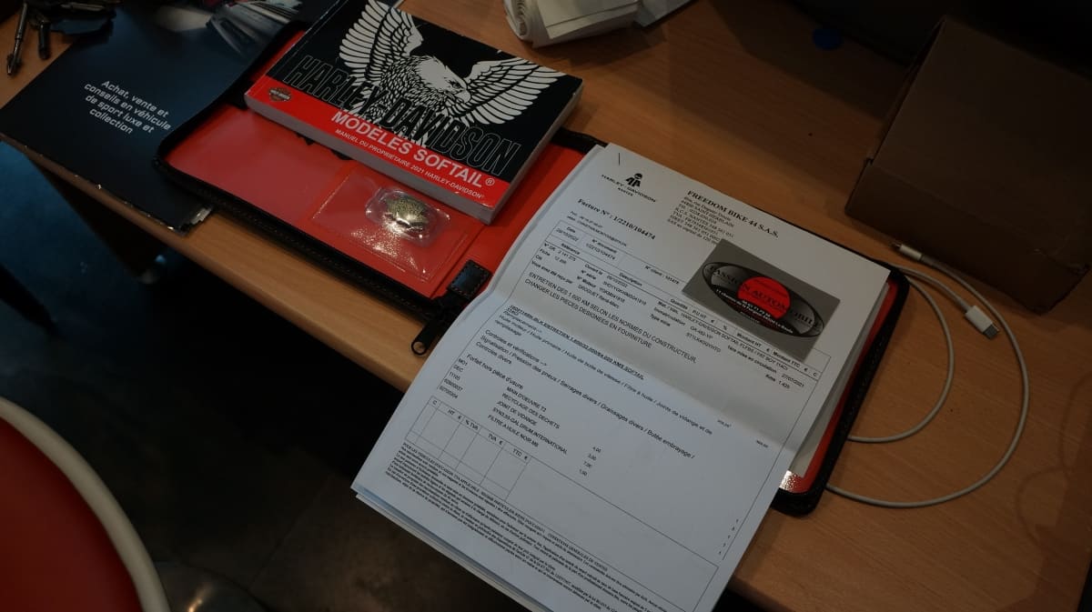 Quelques accessoires ajoutés d\’origine Harley: double sélecteur, bouchon de réservoir, cache bougies, modification plaque arrière avec éclairage à LED.