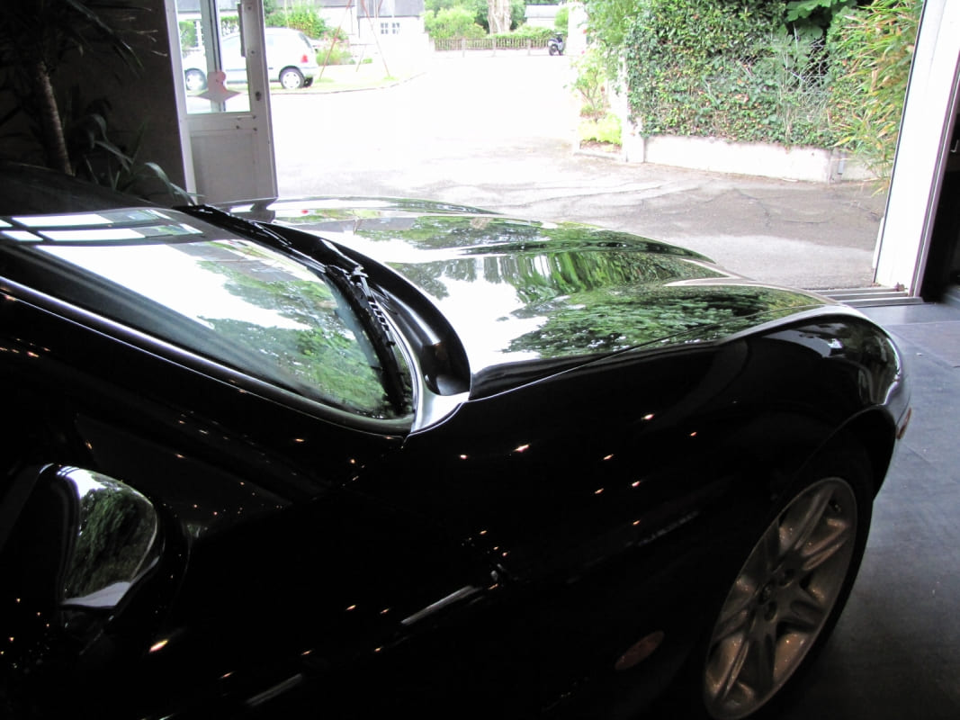 Noir vernis, cuir et capote noir, filet coupe vent et couvre capote.