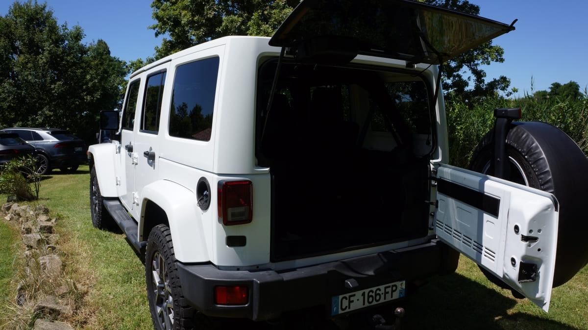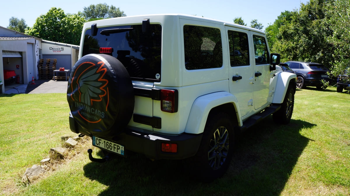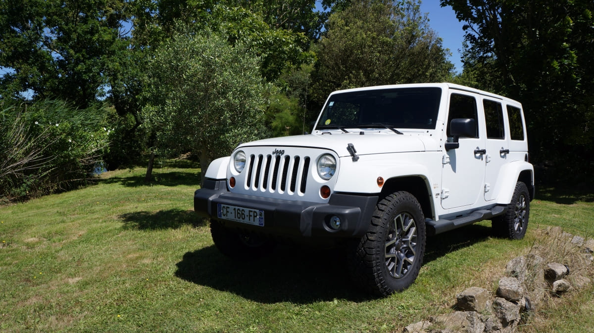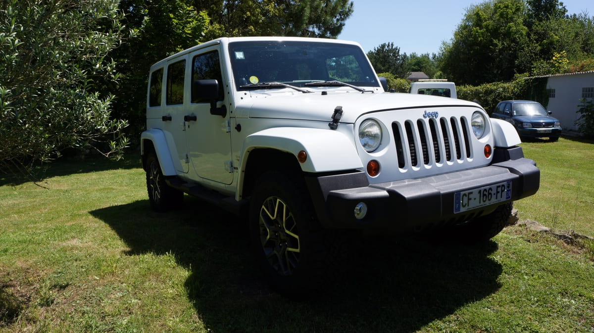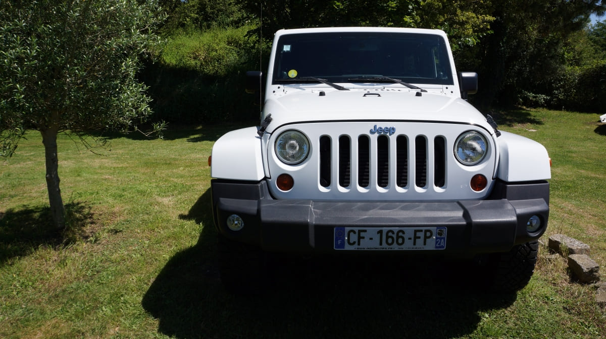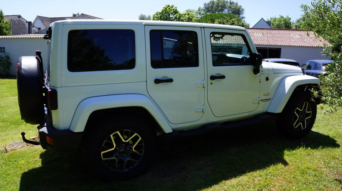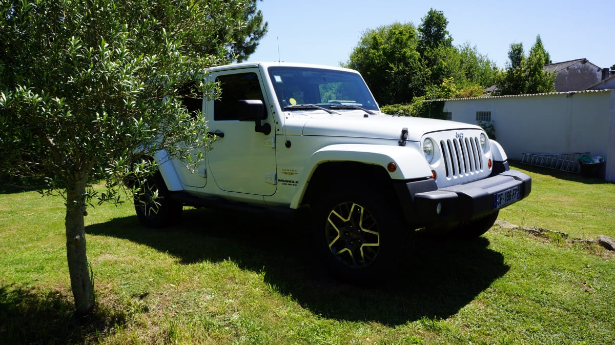 Jeep Wrangler de mai 2012 totalisant 96000 km, boite mécanique 6 vitesses. blanc intérieur tissus gris foncé, Finition Sahara: GPS, Bluetooth, régulateur de vitesse, volant multifonctions, climatisation automatique, attache remorque.