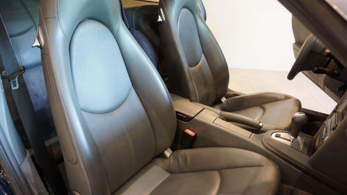Bleu nuit métal, intérieur tout cuir gris pierre.