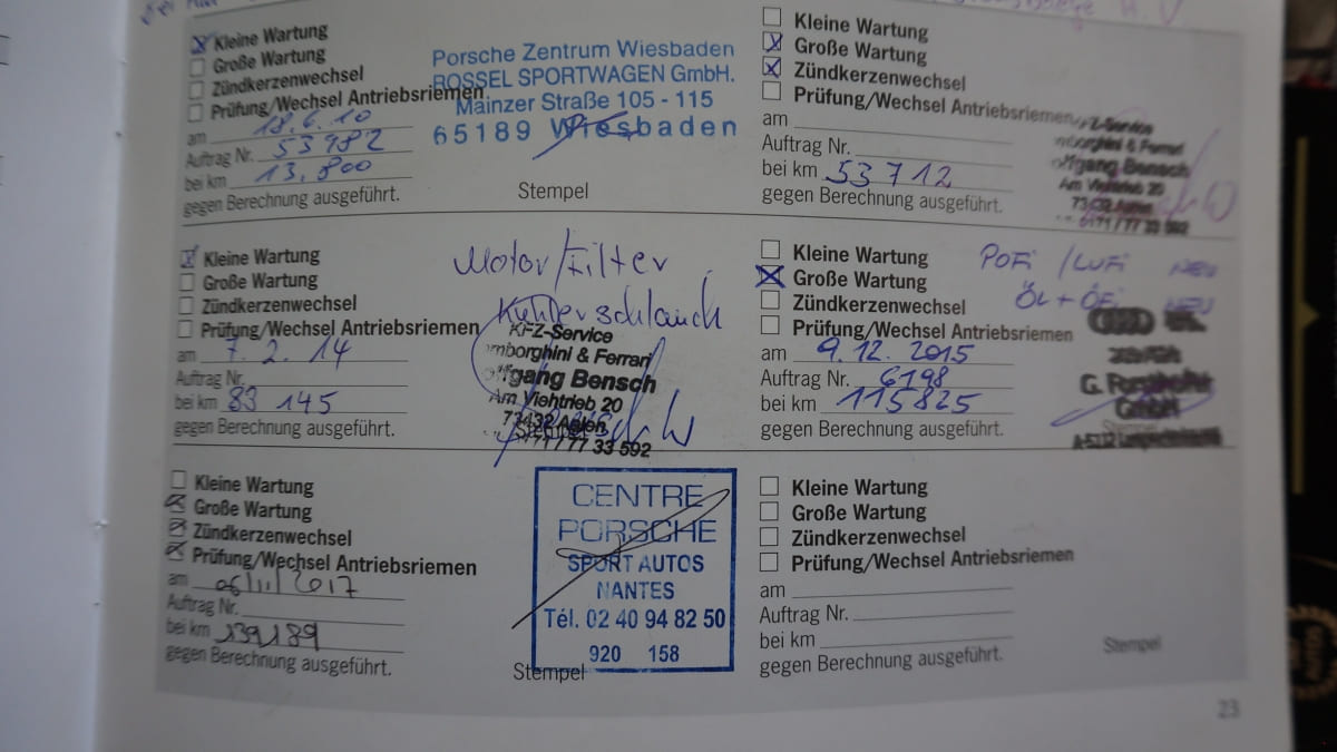 Gros entretien au centre Porsche Nantes à 140000 km avec remplacement de l\’embrayage, 4 pneus, bougies, bobines, tous les filtres, courroie et galets, vidange boite et pont avant, roulement de roue avant.